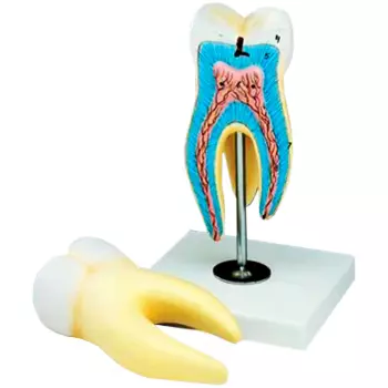 Modelo fraccionado de muela de tres raíces pintada a mano, de material fibra de vidrio, de medidas 12 x 12 x 20 cms. Diseñado para mostrar 8 características numeradas y su cavidad. Incluye soporte base.
